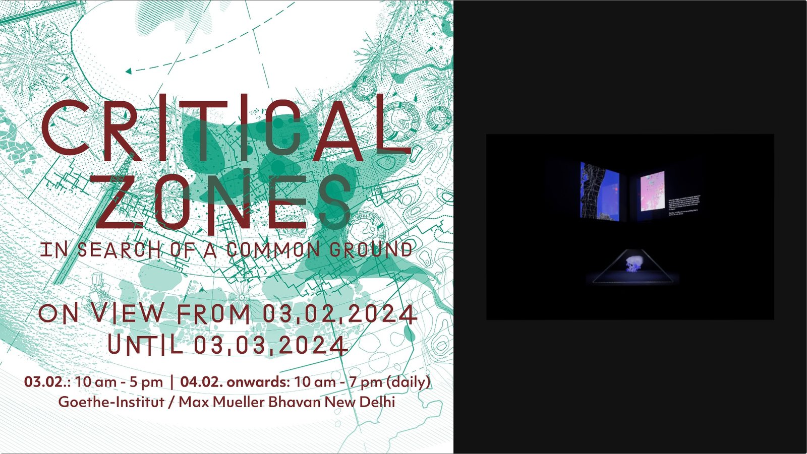 3 February - 9 March, 2024. Goethe Institut, New Delhi."Crackle of an Undying Log", displayed at "Critical Zones", Goethe Institut, New Delhi; conceptualized by Bruno Latour and Peter Weibel, curated by Mira Hirtz and Bettina Korintenberg.