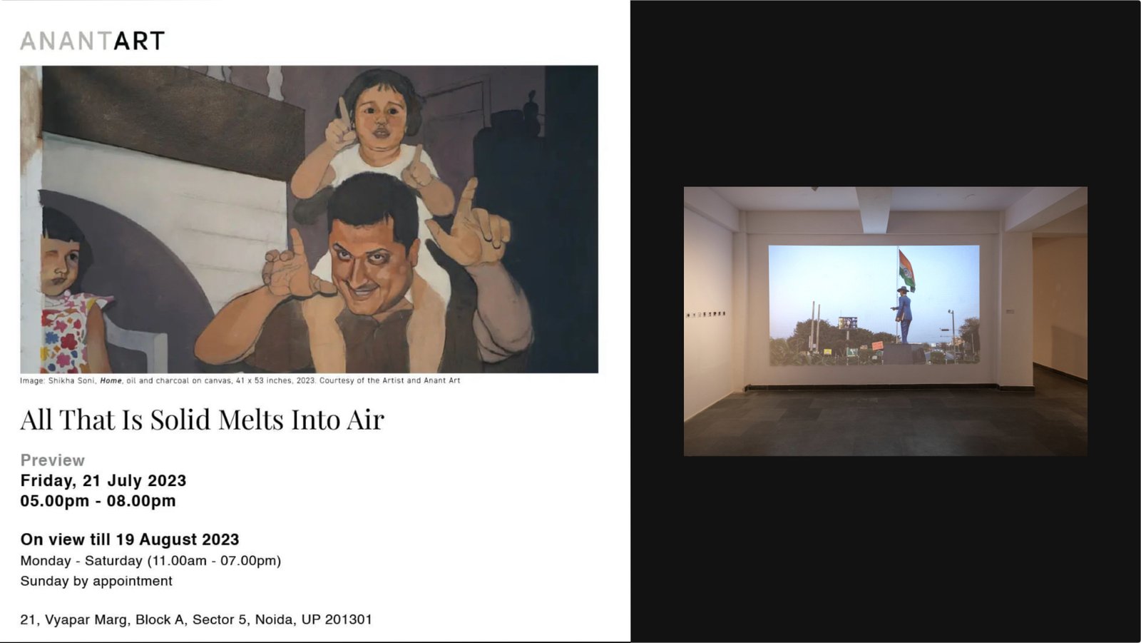 21 July-19 August, 2023. Anant Art Gallery, Noida.“Whisper of an Unfired Shot”, “Dissection of a Spectral Itch”, and “Nationalist Assembly” displayed at All That is Solid Melts Into Air, curated by Arushi Vats, Aditi Ghildiyal and Shankar Tripathi at the Anant Art Gallery, Noida in July 2023.