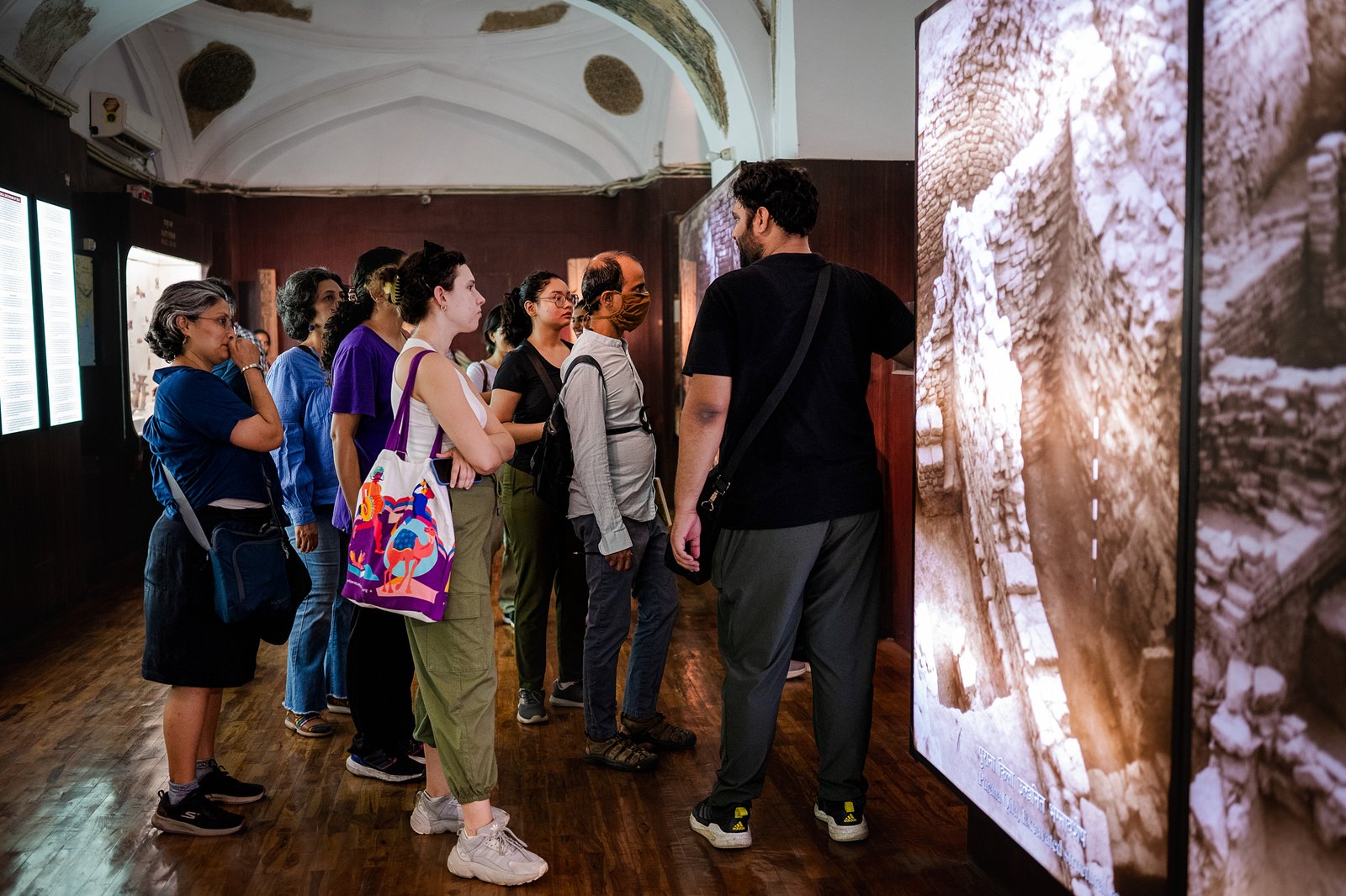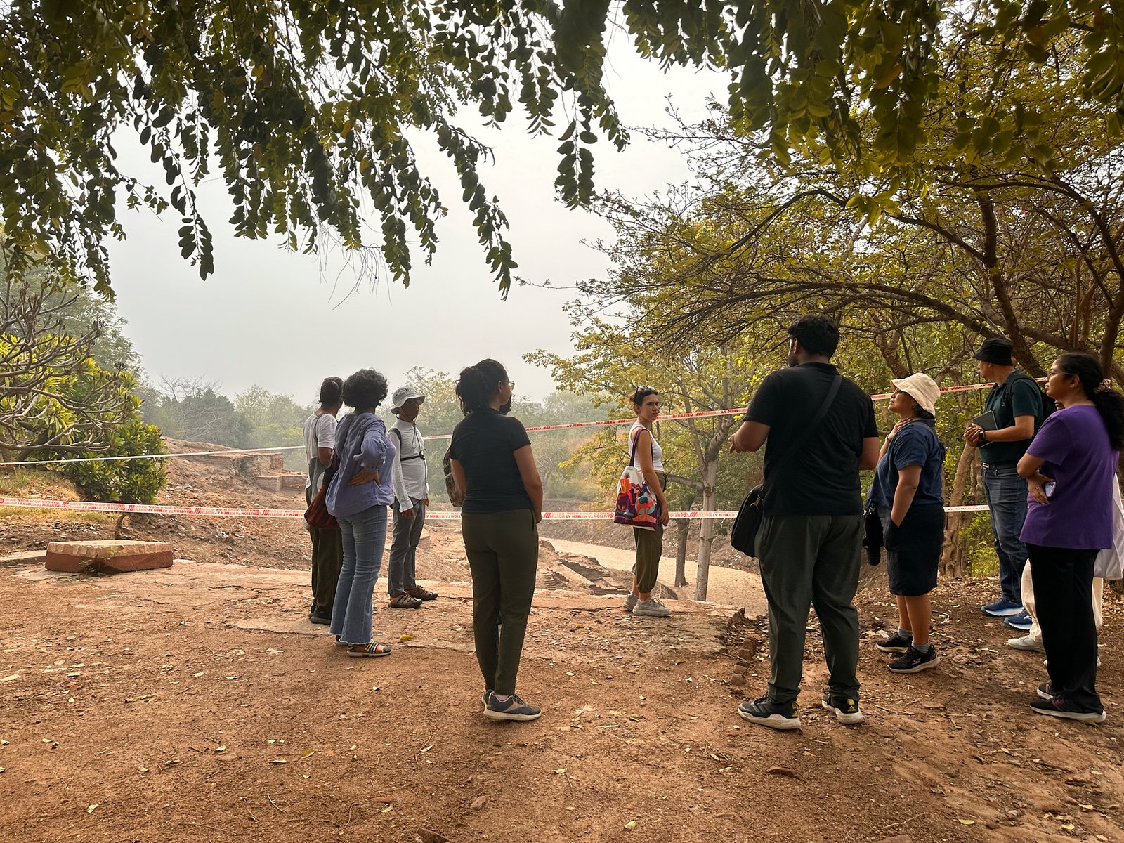 Participants standing beside the mound being excavated for archaeological evidence, Purana Quila, New Delhi.